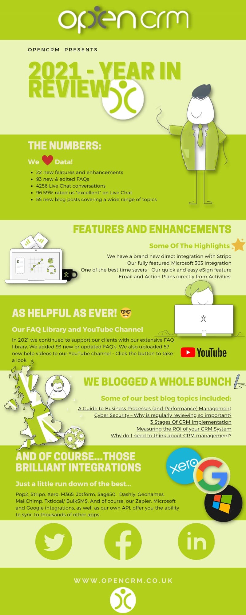 We are kicking off 2022 with a lovely little round-up of some of our activities from 2021. We added new features, enhanced our existing features to make them even better, and added even more amazing integration capability to OpenCRM in 2021. And with an award-winning CRM system collecting all that data…it would be rude not to share it ;-). Take a look at our ‘2021 – Year In Review’ below!