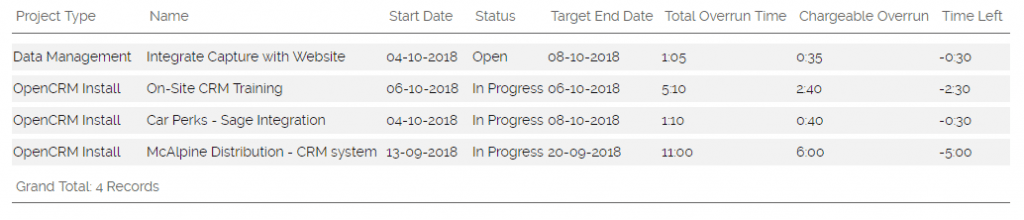 Being able to see which of your ongoing Projects are overrunning on either time recorded or missing their target end date gives you a quick way to see any projects that might need your attention.
